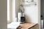 Rakt fram uppenbarar sig det helkaklade badrummet som är utrustat med wc, kommod med handfat, badrumsskåp och dusch. Dessutom är det förberett för tvättmaskin.