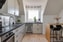 Kök med köksinredning i en ljust utförande. Den mörka bänkskivan matchas snyggt med ett vitt kakel. Den maskinella köksutrustningen består av inbyggd ugn, spishäll, vägghängd spisfläkt och integrerad diskmaskin. Vid den trivsamma fönsternischen finns ytterligare bänk- och skåp yta och på motsatta väggen finns kyl och frys i fullhöjd. Det finns en ombonad yta för matbord och väggarna och golvet går i en ljus kulör.