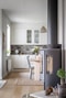 Ljusflödet i vardagsrummet skapar en varm och inbjudande känsla, där rymden förstärks av den öppna planlösningen mot köket. Stora fönsterpartier släpper in rikligt med dagsljus och bjuder på en fantastisk vy över naturen och Mjörns glittrande vatten. Mitt i rummet står en elegant braskamin som sprider både värme och stämning, perfekt för svala kvällar och mysiga stunder. Rummet har stilrent pigmenterade ekgolv och neutrala väggar som ger möjlighet att lätt sätta sin egen prägel. Från vardagsrummet når du den stora balkongen – en förlängning av rummet där du kan njuta av den rogivande sjöutsikten och omgivande grönskan.