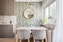 Köket är stilfullt designat med en bänkskiva, skåpluckor i gråbrun nyans och vitgrå marmor ovanför arbetsytan. Den maskinella utrustningen inkluderar spishäll, varmluftsugn, fläkt, diskmaskin samt kyl och frys. Det finns även utrymme för en matplats. Golvet är i parkett, och väggarna pryds av en blommig grön tapet.