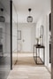 Entré med plats för avhängning och förvaring i medföljande skjutdörrsgarderob. På golvet ligger ekparkett, väggarna är målade i en ljust grå ton.