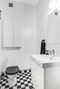 Helkaklat badrum med inbyggt badkar som renoverades 2022. Schackrutigt golv och vita väggar samt takdusch från Tapwell och detaljer från Byggfabriken.