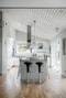 I andra änden av de öppna ytorna ligger det stora köket. Det är centrerat runt en större köksö. Den grafitgrå arbetsytan i natursten fortsätter ut i rummet och skapar ett barhäng med fyra höga sittplatser för morgonens frukost eller lördagskvällens väntande gäster. Köket har fantastiskt ljus från öppningsbara glaspartier ut till terrassytorna med kvällssol. Den till stor del lådbaserade inredningen går i minimalistiskt vitt med diskreta beslag i aluminium. Vitvarorna är helintegrerade med inslag av rostfritt på ugnar och fläkt.