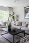 Vardagsrum: Ljust och rymligt vardagsrum i vinkel med matsalsdel och utgång till insynsskyddad uteplats. Ekparkett, beige väggar och stora fönster med markiser. Ursprungligen ytterligare sovrum vid matplats.
