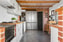 Golv i grå nyans och väggar målade i vitt, vackert kombinerat med synligt Börringetegel och vitt kakel ovanför bänkskivan i massivt trä. Köket är inrett med klassiska spegelluckor i vitt och fullt utrustat med inbyggd mikro, varmluftsugn, diskmaskin, induktionshäll, fläkt, gasspis (wokhäll), vedspis samt kyl och frys i fullhöjd.