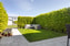 Generös stenlagd uteplats och gräsmatta.