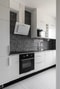 Köket håller en modern standard med vita släta fronter som kompletteras av mörk mosaik ovan en mörk laminatbänkskiva. Maskinell utrustning består av integrerad diskmaskin, fläkt, ugn med häll samt kombinerad kyl och frys som integrerats. Här ryms med fördel cafébord eller barbänk in.