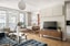 Härligt och trivsamt vardagsrum som badar i ljus från de stora fönsterpartierna. Välplanerad och social planlösning mot köksdel. Här finns plats för både en större soffgrupp, soffbord, tv-möbel samt annat möblemang. Från vardagsrummet nås en av bostadens magiska balkonger.