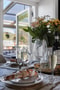Vardagsrummet har en trevlig planlösning som lämpar sig ypperligt för sociala sammanhang. Här finns gott om plats för både en rymlig soffhörna och det större matbordet.