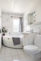 Intill sovrummet ligger ett helkaklat badrum med ljust kakel och klinkers. Här finns bubbelbadkar, toalett, kommod och badrumsskåp.