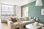 Sovrummet är generöst tilltaget och avgränsat med skjutdörr. Här ryms en dubbelsäng, skrivbord och extra förvaring i garderober längs ena väggen. Fint ljusinsläpp från fönsterpartiet. Alla fönster i bostaden har persienner.