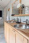 Funktionell tvättstuga med tvättmaskin, torktumlare, ho och arbetsbänk. Gott om plats för klädvård.