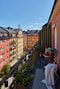 Charmig 1:a högst upp med kungsbalkong och utsikt över takåsarna – stabil förening med låg avgift