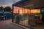 Exklusiv pergola från Pergolux 2024 med elektriskt öppningsbart tak och två inglasade sidor.