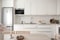 Det stilfulla köket i vit ton är en dröm för den som älskar att laga mat, med moderna bekvämligheter och gott om förvaringsutrymme.