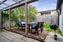 Bostaden har ett generöst vardagsrum med utgång till en stor, insynsskyddad uteplats som kombinerar stenläggning med gräsmatta – perfekt för både avkoppling och sociala stunder. Köket är välutrustat med god förvaring och plats för matbord intill fönstret. Det fräscha badrummet är utrustat med badkar, och det rymliga sovrummet vetter mot uteplatsen på baksidan och erbjuder en lugn plats för vila. För extra förvaring finns både en klädkammare och ett separat förråd på cirka 15 kvm. På framsidan av huset finns ytterligare en uteplats i soligt sydvästläge, inramad av vackra buskar.