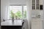Köket nås till höger från hallen och är ljust och hemtrevligt med vita köksluckor, guldiga handtag och ett vitt kaklat stänkskydd som ramar in arbetsytorna på ett stilrent sätt. Den vita bänkskivan harmonierar med resten av kökets uttryck, och de marmorerade klinkerplattorna från hallen löper vidare här för en enhetlig känsla. Ett fönster vid matplatsen släpper in gott om dagsljus och skapar en inbjudande miljö för både vardagsmiddagar och helgfrukostar. Utrustat med vask, diskmaskin, induktionshäll, fläkt, ugn, kyl och frys.