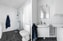 Helkaklade väggar i vitt och mörkt klinkergolv. Duschplats med glasvägg och golvbrunn, handdusch på stång samt hyllor i hörn. WC och handfat i kommod. Spegel med överbelysning. Tvättdel med tvättmaskin, arbetsbänk och väggskåp ovan.
