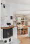 Stort vardagsrum med braskamin, askparkett och vitmålade väggar. Här finns gott om plats för både matsalsbord och soffgrupp. Generös takhöjd och ljusinsläpp från tre väderstreck skapar en luftigt och ljust rum.