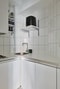 Ljusa brädgolv och ljusa väggar. Köket är utrustat med gasspis, fläkt, kyl med frysfack och hyllplan.