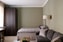 Ljusa brädgolv och gröna väggar. I vardagsrummet finns plats för matbord, säng och soffgrupp.