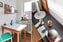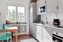 Brädgolv och vita väggar. Köksinredning utgörs av grå skåpsluckor, marmorinspirerad arbetsyta och stänkskydd i vitt kakel. Maskinell utrustning består av induktionshäll, spisfläkt, diskmaskin, ugn och mikrovågsugn. Matplats för 2 personer.