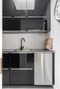 Köket renoverades 2016 och har en modern och stilren design med svarta luckor från IKEA, vit kaklad vägg, svart bänkskiva och rostfria vitvaror. Här finns all maskinell utrustning du kan önska – induktionshäll, varmluftsugn, mikro, inbyggd kyl och frys samt diskmaskin – och överskåpen går hela vägen upp till taket för att maximera förvaringen.