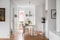 Funktionell och rymlig hall med parkett, vitmålade väggar och plats för förvaring.