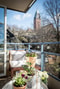 Från köket når du bostadens stora balkong – en underbar plats med sol från förmiddag till kväll. Här kan du njuta av utsikten mot Masthuggskyrkan och lugnet från den grönskande omgivningen. Trätrallen gör det extra inbjudande att möblera för både avkoppling och umgänge.