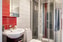 Den helkaklade gästtoaletten med klinkergolv och golvvärme totalrenoverades 2014 och är utrustad med duschkabin, wc samt tvättställ.