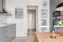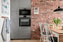 Köket kombinerar modern funktion med klassisk karaktär, bland annat tack vare en dekorativ tegelvägg. Här finns grå köksinredning med bra förvaringslösningar och vitt kakel som ramar in arbetsytorna. Utrustningen består av kyl/frys, induktionshäll, inbyggd ugn och mikro samt fläkt. Det finns dessutom gott om plats för en matgrupp.