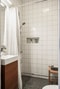 Badrummet renoverades 2009. Helkaklat med grått klinkergolv i grafitmosaik och vit kakelsättning på väggarna. Utrustat med handdukstork (2009), WC (IFÖ), handfat (Lindströms), dusch (Hans Grohe) samt badrumsskåp (Ikea 2009).