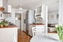 Köket stoltserar med smakfull köksinredning som utgörs av vita köksluckor med krombeslag, diskho och köksblandare samt vitt kakel ovanför arbetsbänk. Köksutrustningen består av kombinerad kyl/frys, induktionsspis, fläkt, varmluftsugn, inbyggnadsmikro och integrerad diskmaskin. Väggarna är målade i vitt.