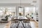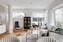 När vi tar steget in i allrummet öppnar bostaden upp sig ordentligt. De stora fönsterpartierna skapar ett fantastiskt ljusinsläpp och tillsammans med den genomgående fiskbensparketten får vi en varm och elegant atmosfär. Här finns gott om plats för både soffgrupp och matbord, och rummets form gör det lätt att möblera efter behov och livsstil. Det är en social och trivsam yta där vi gärna dröjer oss kvar.