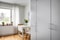 Bostaden är belägen en trappa upp med en välplanerad och genomgående planlösning. Vi ges en renoverad lägenhet med stilrena materialval och här kan vi flytta rätt in. Ljusgrått kök som renoverades 2019 med släta luckor, hexagon kakel i marmor och bänkskiva i trä. Diskmaskin och full kyl och frys. Plats för matbord där vi har trivsam utsikt över föreningens innergård. Parkettgolv i alla rum och ljusgråa väggar.