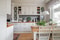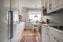 Köket är rymligt och trivsamt med stort fönster, utgång till balkong och naturlig plats för cirka sex personer kring matbordet. Inredningen från JKE sattes in av snickare 2015 i vit kulör och kombineras med ekbänkskivor samt kakel i grått halvstensförband. På golvet ligger ekparkett. Den maskinella utrustningen består av spis från Electrolux, fläkt från Franke, inbyggd mikro från Bosch samt kyl, frys och diskmaskin från Siemens.
