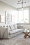 Till höger från hallen öppnar sig det stora vardagsrummet med rikligt ljusinsläpp från de breda fönstren. Ljuset skapar en luftig och trivsam miljö, och rummet är lätt att möblera tack vare dess smarta planlösning. Här ryms enkelt en bekväm soffgrupp, soffbord och tv-möbel – perfekt för avkopplande hemmakvällar. De ljusa väggarna förstärker rummets öppna känsla, och det finns även möjlighet att placera en mindre matgrupp här, vilket gör detta till en perfekt plats att umgås på.