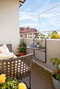 Mysig balkong belägen i soligt söderläge och utsikt över grön gård.