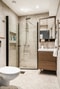 Renoverat 2023 i stilrent utförande med klinker på både golv och väggar. Här finns dusch med glasvägg, handfat från Strandh med kommod samt WC. Infällda spotlights i taket och med både golvvärme och handdukstork bidrar till extra komfort. Ett modernt och lättskött badrum med genomtänkta materialval.