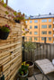 Den öppna planlösningen mellan vardagsrum och kök ger en social och inbjudande atmosfär. Härifrån nås balkongen som vetter mot innergården och blir som en naturlig förlängning av bostaden under sommarhalvåret. Balkongen erbjuder plats för både möbler och odling och är en perfekt plats för morgonkaffet.