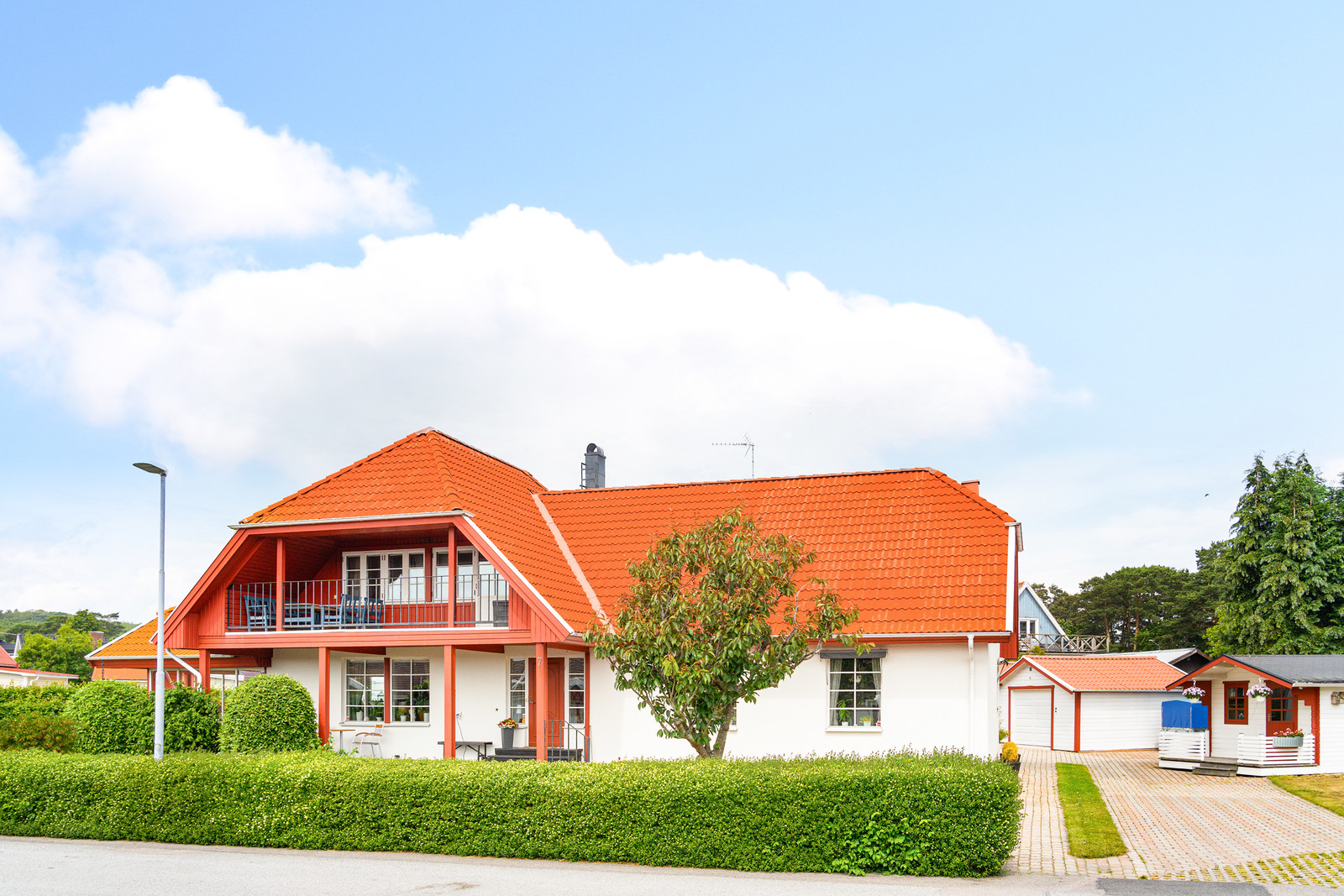 Rymlig och stilfull villa med inglasat uterum, balkong med havsutsikt, gästhus och garage.