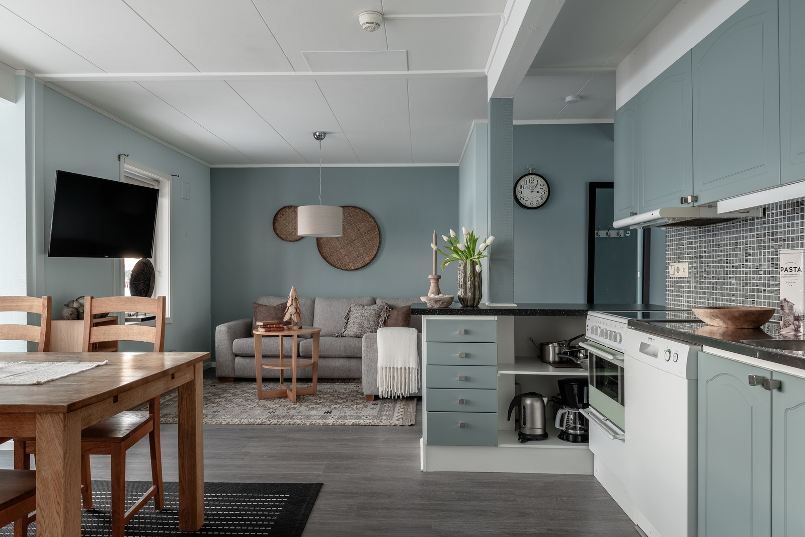 Lägenheten rymmer tre rum och kök, varav två generösa sovrum som erbjuder en flexibel sovlösning. Här kan du antingen skapa två master bedrooms med dubbelsängar eller välja den nuvarande konfigurationen med en dubbelsäng och två våningssängar, vilket ger hela sex sovplatser – perfekt för både familjen och vännerna. I storstugan samlas man för umgänge och köket är i öppen planlösning till resterande. Dessutom erbjuds här både bastu och en mindre uteplats i sydvästläge.