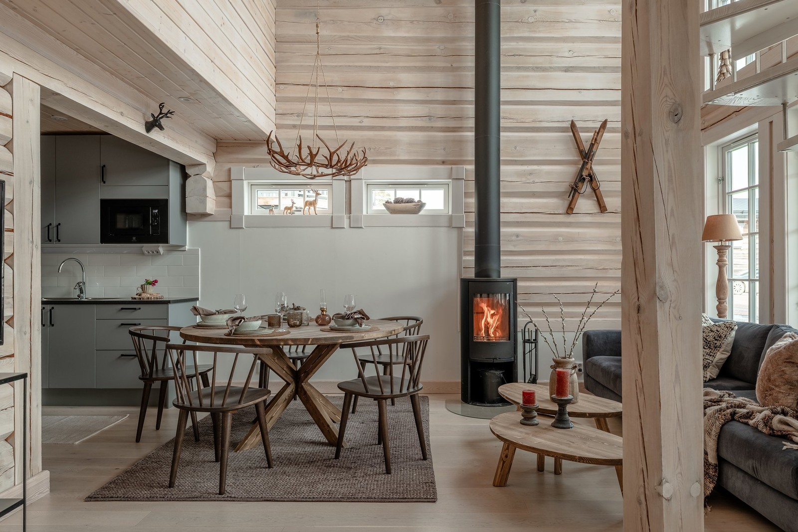 Med sina 83 välplanerade kvadratmeter rymmer bostaden tre sovrum, två badrum, bastu och ett kök från Marbodal. Storstugan har braskamin, öppet ryggåstak och ett vackert ljusinsläpp. Det robusta timret ger värme och karaktär, medan planlösningen gör plats för både avkoppling och umgänge. Kök och vardagsrum binds samman i en öppen lösning – här lagar du middagen utan att missa kvällens samtal eller sällskapets kortspel framför kaminen.