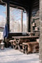 Utgång från storstugan med vindskyddad matplats och utsikt mot Hundfjällets toppstuga.