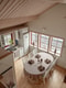 Parkettgolv, målad väv på väggar, träpanel i tak och synliga takbjälkar. Öppen planlösning med generösa sällskapsytor och öppet till nock. Plats för större soffgrupp och matbord. Braskamin från Handöl.