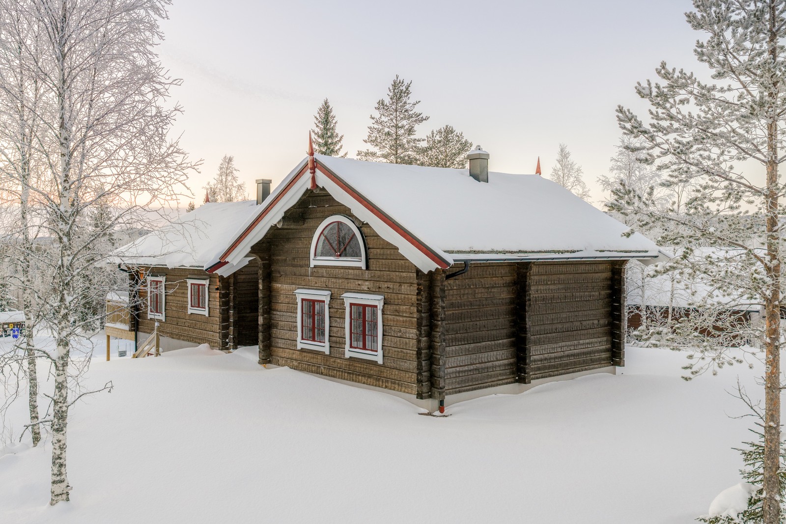 Invändigt möts ni av doften av massivt trä. Synliga timmerväggar, kraftiga bjälkar och en generös takhöjd som ger rymd och närvaro. 141 kvm där varje volym är förberedd för att bli något personligt. Här kan ni skapa en egen lodge med mörkare trätoner, natursten och skräddarsydda snickerier, eller varför inte en ljusare, mjuk nordisk tolkning där textilier, sandtoner och balanserad ljussättning samspelar med timrets karaktär. Altanen på huset löper generöst från framsidan i söderläge och vidare runt huset mot väster. Här följer ni solen hela vägen mot horisonten från morgon till kväll.
