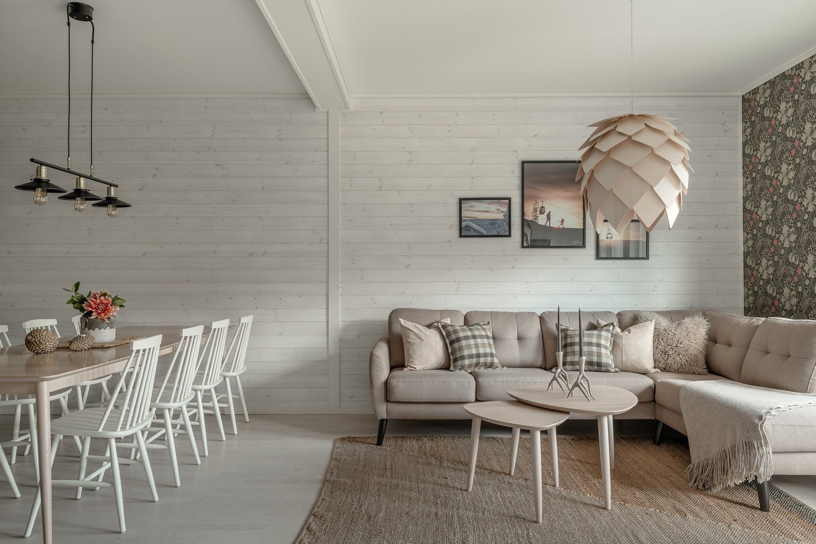 Köket från Marbodal är mörkt grått och tillsammans med den vitlaserade träpanelen och de ljusa väggarna skapas en varm kontrast och en harmonisk helhet. Från storstugan och balkongen flödar ljuset in och utsikten över pistsystemet påminner om att fjällupplevelsen väntar precis utanför. Här råder en atmosfär som är lätt att göra till sin egen men som redan idag upplevs både fräsch och välkomnande.