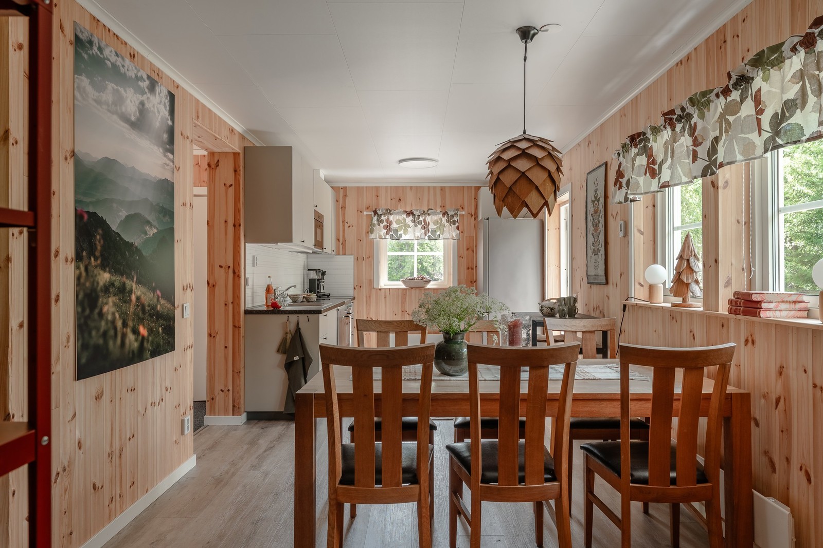 Storstugan samlar både vardagsliv och umgänge i ett och samma rum. Här ryms matplats, kök och sällskapsdel, med utgång till trädäck på baksidan. Matplats för cirka åtta personer med halvöppen planlösning mot TV-rummet.
