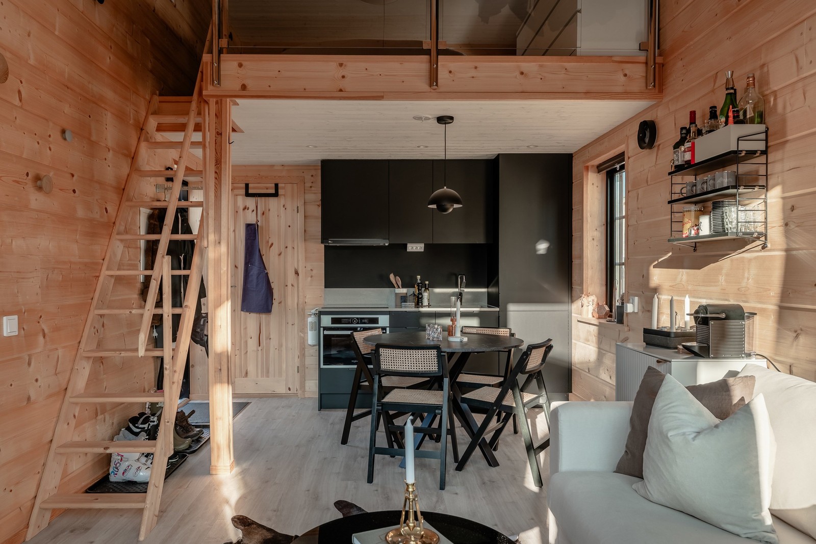 Invändigt sätts tonen av träpanel i både tak och väggar och ett praktiskt träinspirerat golv i vaniljton – en varm och ombonad grund för både vintermorgnar och sommarkvällar.