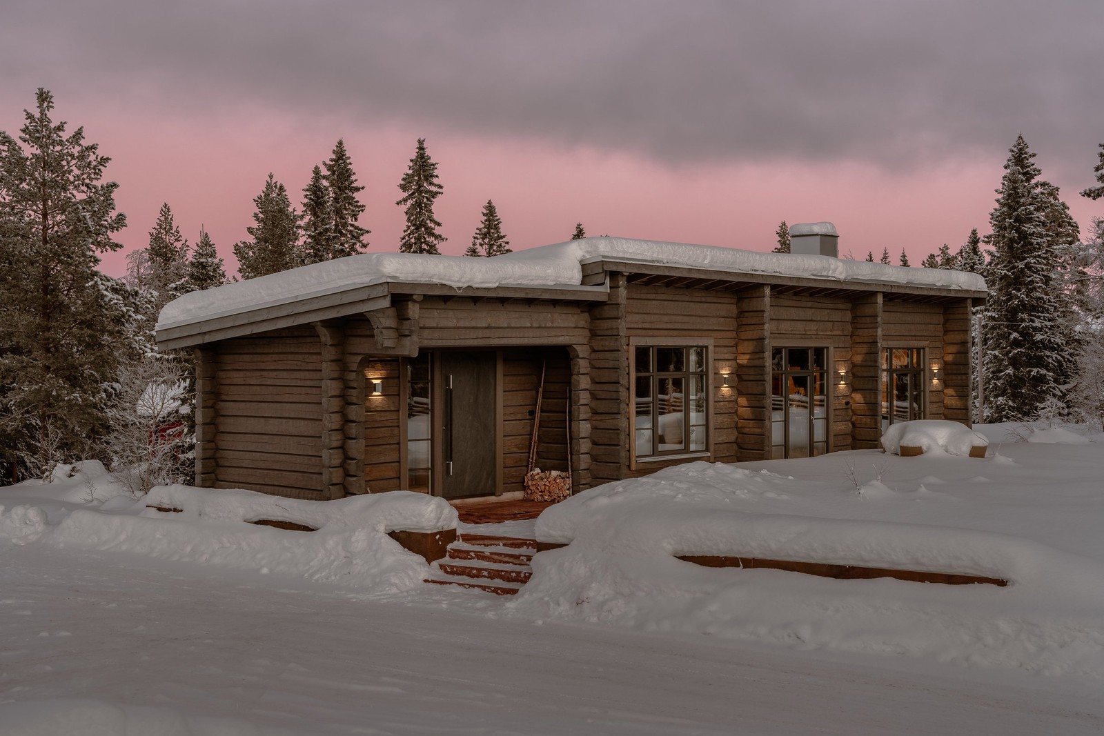 Redan utifrån signalerar huset något annat än det förväntade. Den låga, horisontella formen, det massiva timret och det mjukt sluttande taket ger ett lugnt men självsäkert uttryck. Läget på höjden skapar både närvaro och avskildhet, ni kliver upp från Fjällvägen och in i en egen värld samtidigt som Sälfjällstorgets restauranger, barer, service och puls finns bara några steg bort.